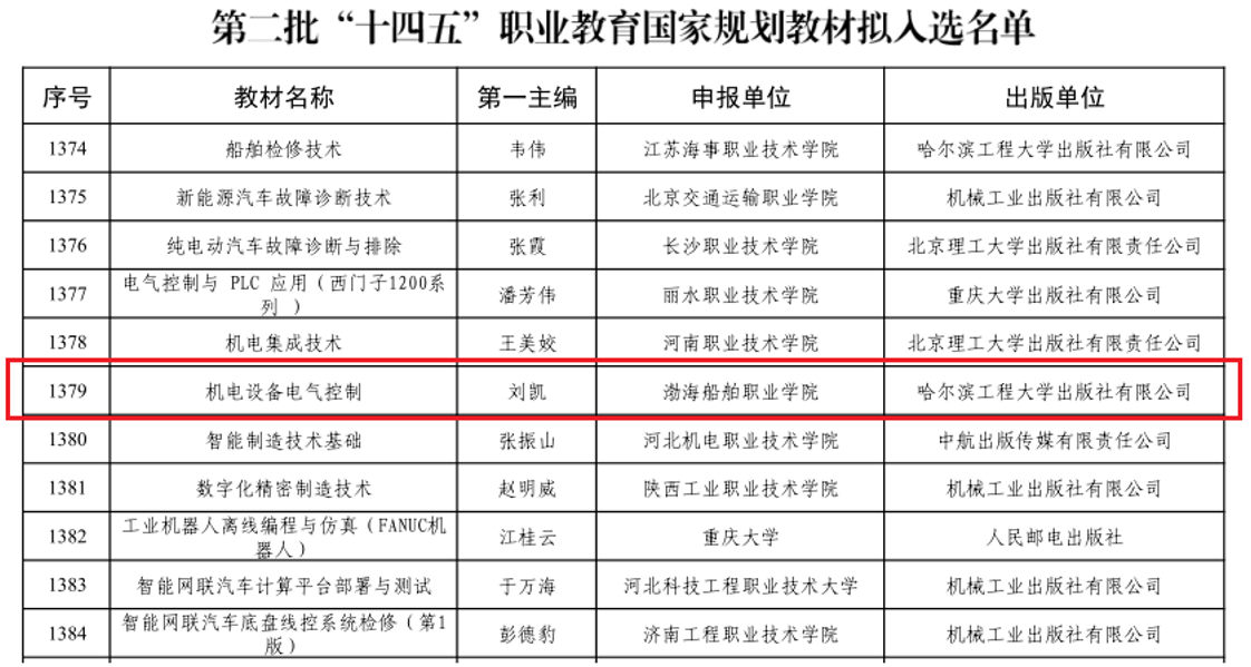近日,教育部公示了第二批”十四五“职业教育国家规划教材遴选结果,由我校机械工程与自动化学院刘凯教授主编,哈尔滨工程大学出版社有限公司出版的《机电设备电气控制》成功入选,这是本教材继2022年入选辽宁省职业教育“十四五”首批规划教材之后取得的又一成绩。